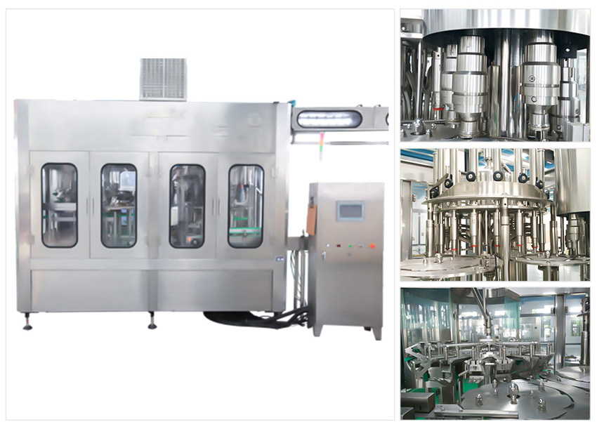 The machine combines washing, filling and capping with complete automation, suitable for filling juice and tea beverage. With temperature controller, it can also conduct thermal filling. It is used for all kinds of bottles. The bottle neck hanging technology makes the process of changing bottles easily by only adapting the height of conveyor chain. The filling process adopts hot filling technology with water-supplying system under constant pressure, which makes filling process faster and more stable. Compared with other equipment of same kind, this machine with a better quality and thus enjoys a high ratio of function against price. The hot filling type machine works with balanced tank and vacuum system.